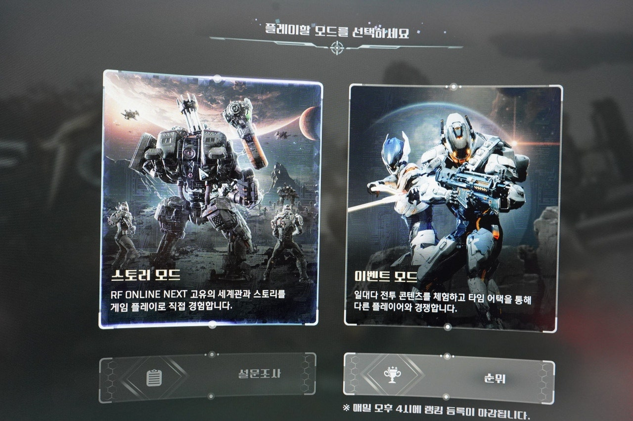 시연대 모니터 밑에는 RF 온라인 넥스트를 즐기는데 필요한 조작 가이드롸 세팅가이드가 준비되어 있어 원하는 모드를 선택해 할 수 있었는데요, 스토리모드와 이벤트 모드 모두 시연이 가능한 점이 인상적이었습니다.
