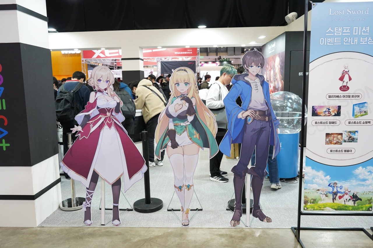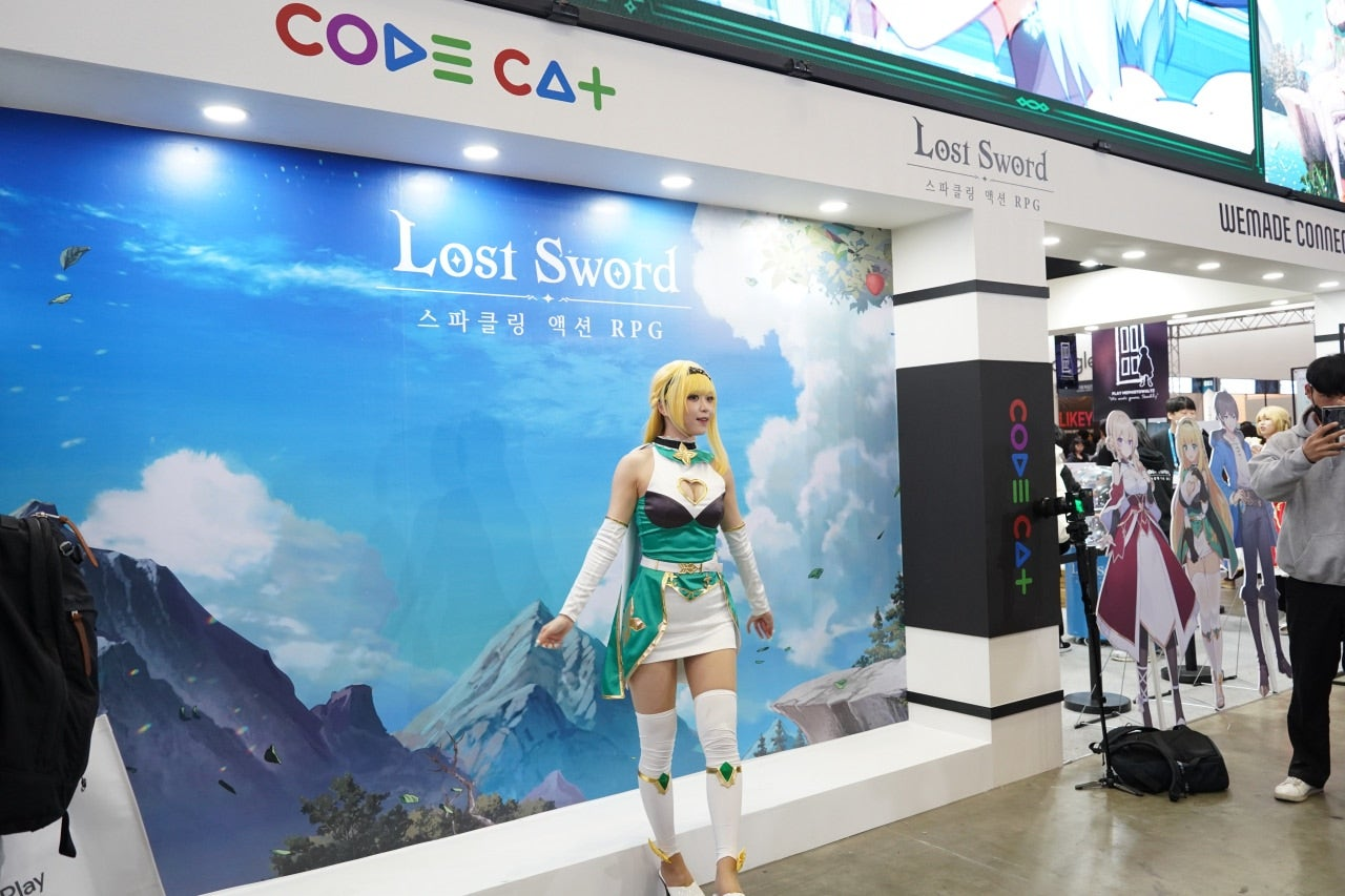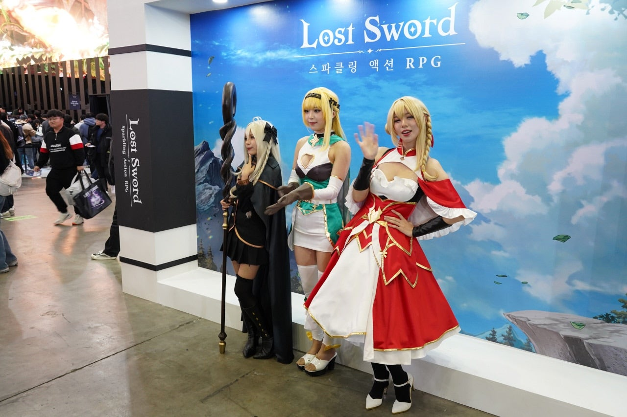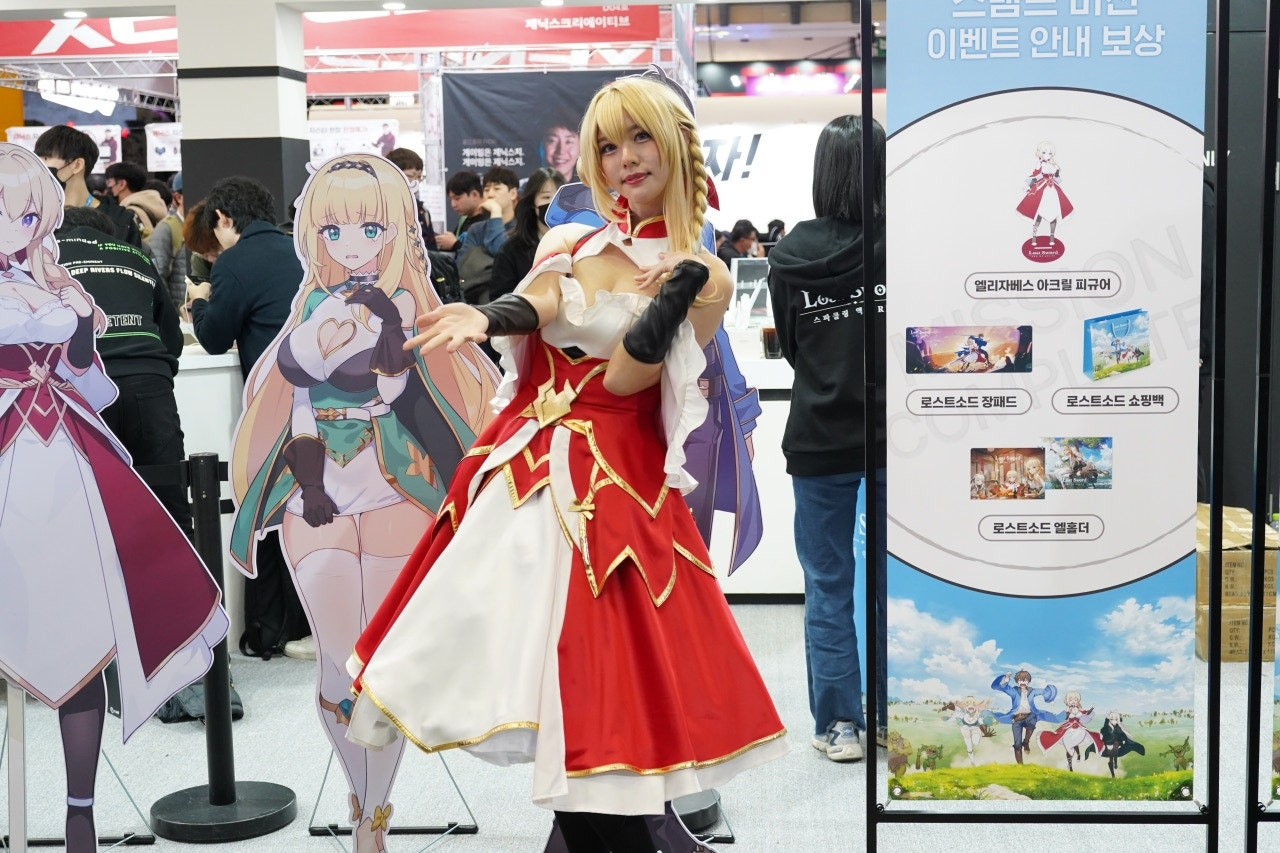 로스트소드 부스는 BTC1관 D02에 위치하고 있습니다. 입구에서 왼쪽 안으로 쭉 들어가면 바로 확인할 수 있어 찾기 어렵지 않답니다. 무엇보다 부스에 들어서기도 전 입구에서부터 코스어분이 관람객들을 마주하고 있었는데요, 부스 안팎으로 인산인해를 이루고 있어 많은 분들의 높은 관심을 고스란히 확인할 수 있었습니다.