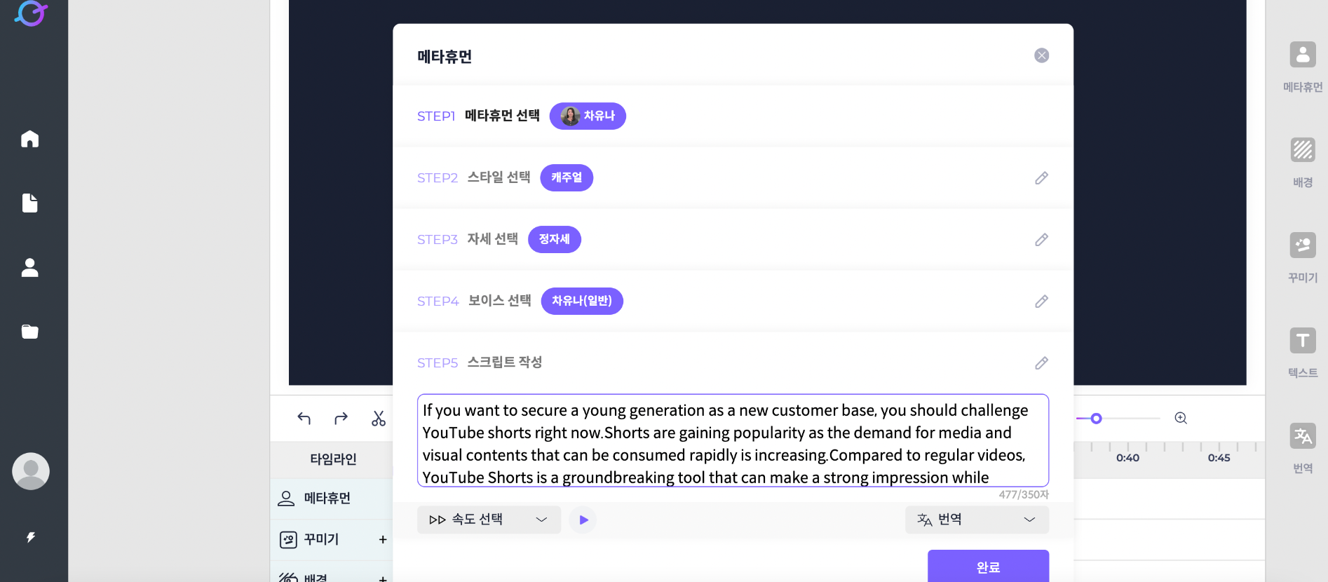 메타휴먼과 화면 사이즈를 선택했다면 스크립트를 작성해야 합니다. 스크립트의 경우 350자까지 지원되어 원하는 내용을 전달하기에 부족함이 없는데요, 이때 번역 기능을 사용하면 즉시 해당 스크립트의 번역되어 유용하게 활용할 수 있는 점도 특징입니다.