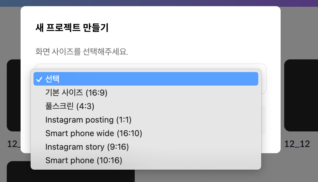 생성형 AI 서비스 플루닛 스튜디오에서는 다양한 화면 사이즈를 제공하고 있어 원하는 플랫폼에 맞춰 생성이 가능합니다. 기본 사이즈는 16:9로 설정되며 풀스크린을 비롯해 인스타그램, 스마트폰, 쇼츠등의 사이즈가 준비되어 영상 제작 후 추가적인 사이즈조절이 필요 없어 편리합니다.