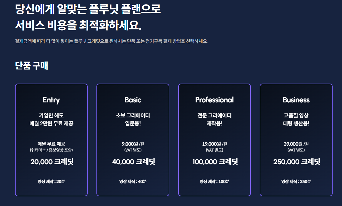 처음엔 무료로 생성형 AI 서비스 플루닛 스튜디오을 사용해 보고 원하는 요금제를 선택할 수 있는데요, 영상을 자주 제작해야 하는 기업이나 개인이라면 정기구독을 통해 일정비용으로 필요한 만큼의 영상을 제작할 수 있는 요금제를 갖추고 있고, 특수 요청은 상담도 가능해 훨씬 수월하게 원하는 영상을 제작할 수 있습니다.