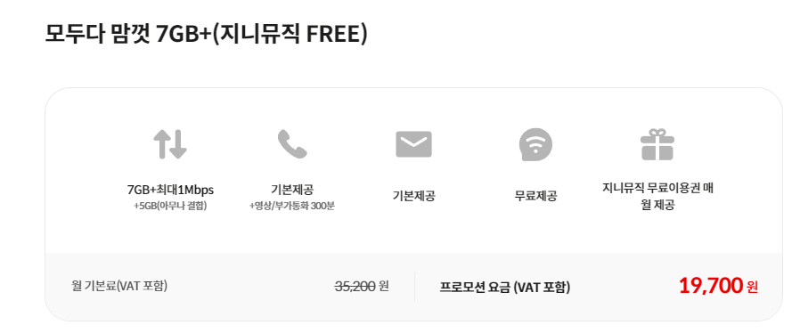 음악을 주로 듣는 분들이라면 모두다 맘껏 7GB+(지니뮤직 FREE) 요금제를 추천드립니다. 7GB+ 아무나 결합시 5GB 추가제공 +최대 1Mbps 데이터 무제한 + 통화 문자 무제한혜택과 함께 요금제 가입기간 동안 지니뮤직 어플을 무료로 사용할 수 있는데요, 1만 원대 통신비로 이 정도 조건의 요금제는 많지 않은 만큼 원하는 혜택도 챙기고 통신비도 절약하고 싶다면 kt M모바일 알뜰폰 요금제가 답인 것 같습니다.
