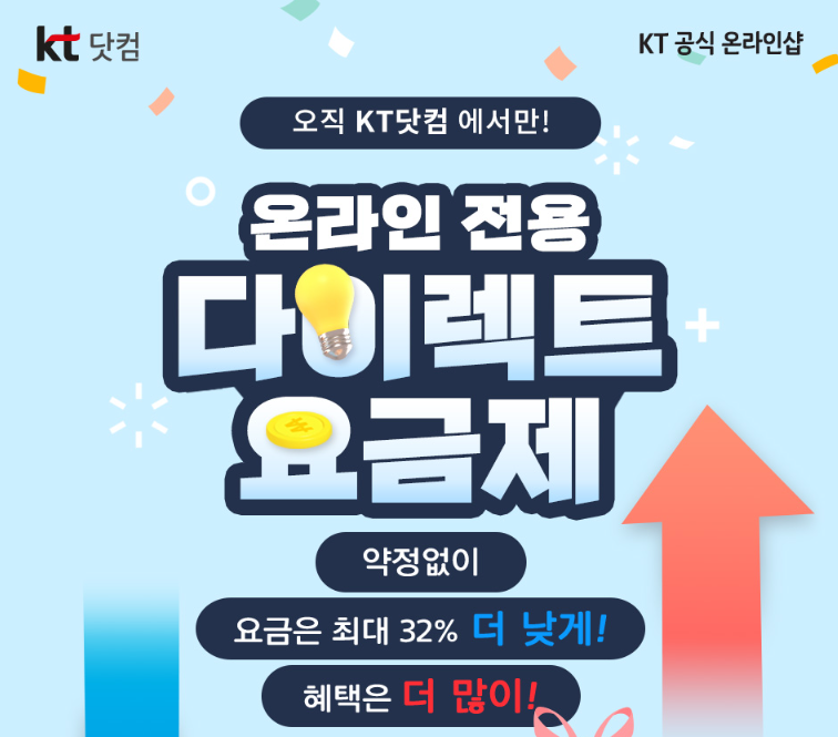 최근 5 G 요금제로 변경하면서 KT다이렉트 요금제를 알게 되었는데요, 데이터와 통화 및 문자는 기본, 다양한 결합할인을 묶어 다양한 혜택을 선택할 수 있는 점이 특징입니다. 특히 다이렉트 요금제는 오직 KT닷컴에서만 약정 없이 요금은 최대 32% 더 낮게 혜택은 더 많이 받을 수 있어 많은 분들이 선택하고 있기도 합니다.