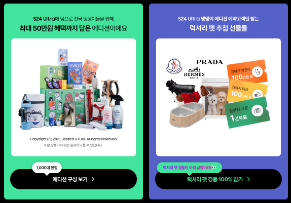 특히 사전예약을 통해 갤럭시S24를 신청하면 최대 50만원의 혜택이 담긴 댕댕이 에디션 선물도 수령할 수 있습니다. 갤럭시S24 울트라 댕댕이 에디션 예약 고객을 위한 럭셔리 펫 추첨 선물도 준비되어 있는데요, 이 모든 혜택은 오직 유플러스닷컴 온라인 단독혜택으로 준비된 만큼 이번 사전예약에 참여해 모든 혜택을 챙겨보시기 바랍니다.