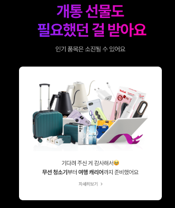 중고폰 추가 보상도 주어지는데요 삼성 트레이드인 15만 원에 닷컴 추가 보상 15만 원까지 주어져 최대 92만 원 보상 수령도 가능합니다. 개통 선물로 무선 청소기부터 여행 캐리어 선물등 다양하게 준비되어 있어 선택하여 수령할 수 있는 만큼 받을 수 있는 혜택이 어마어마하다고 할 수 있습니다.