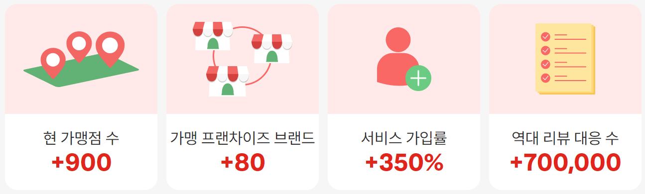 리뷰똑똑은 현재 900여 개가 넘는 가맹점과 80개가 넘는 가맹 프랜차이즈 브랜드를 관리하고 있습니다. 서비스 가입률도 350%를 넘어가는데요, 역대 리뷰 대응수가 70만 개 이상으로 업계 1위에 빛나는 타이틀을 가지고 있어 신뢰할 수 있기도 합니다.