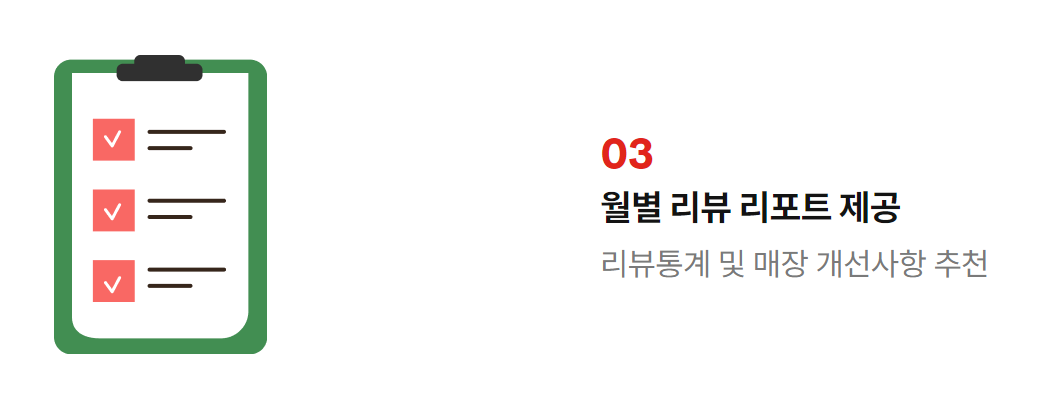 한 달 동안 배달앱에 올라온 리뷰에 대한 별점 통계를 비롯해 내용을 분석해 월별 리뷰 리포트가 제공됩니다. 매일 올라오는 리뷰를 정리하고 어떤 의견이 있는지 일일이 검토할 필요 없이 월별 리뷰 리포트 하나로 검토하고 어떤 사항들을 개선하면 좋을지 확인해 보세요.