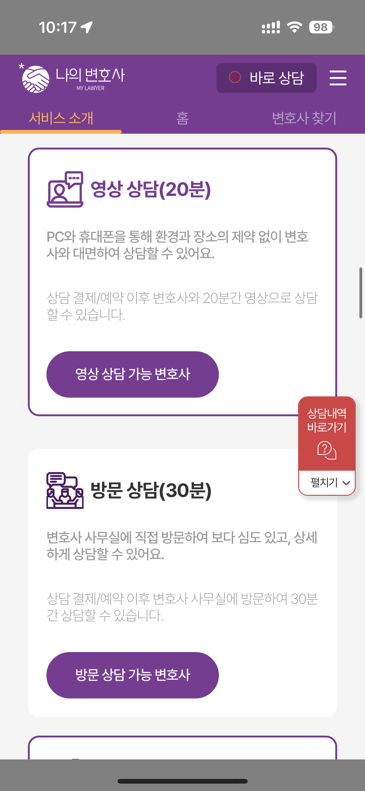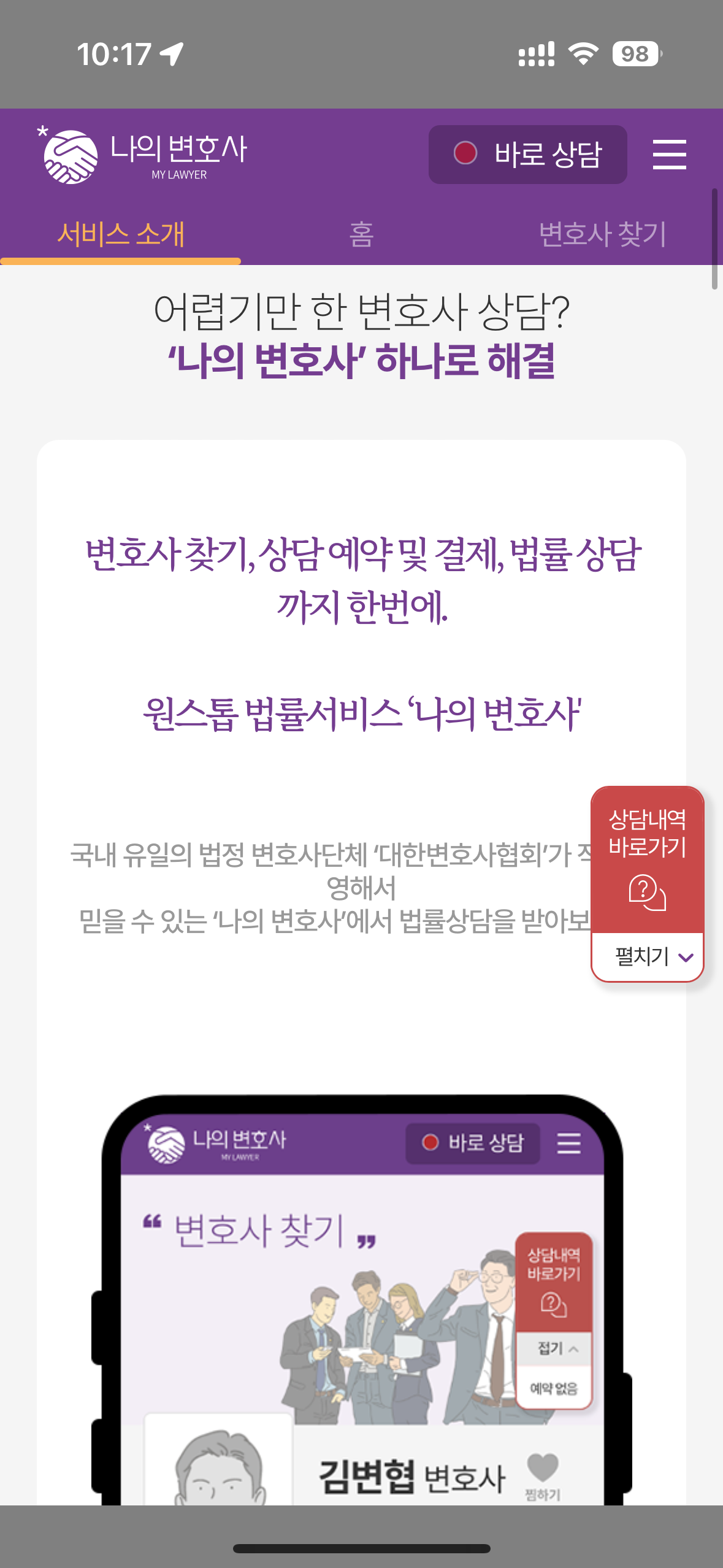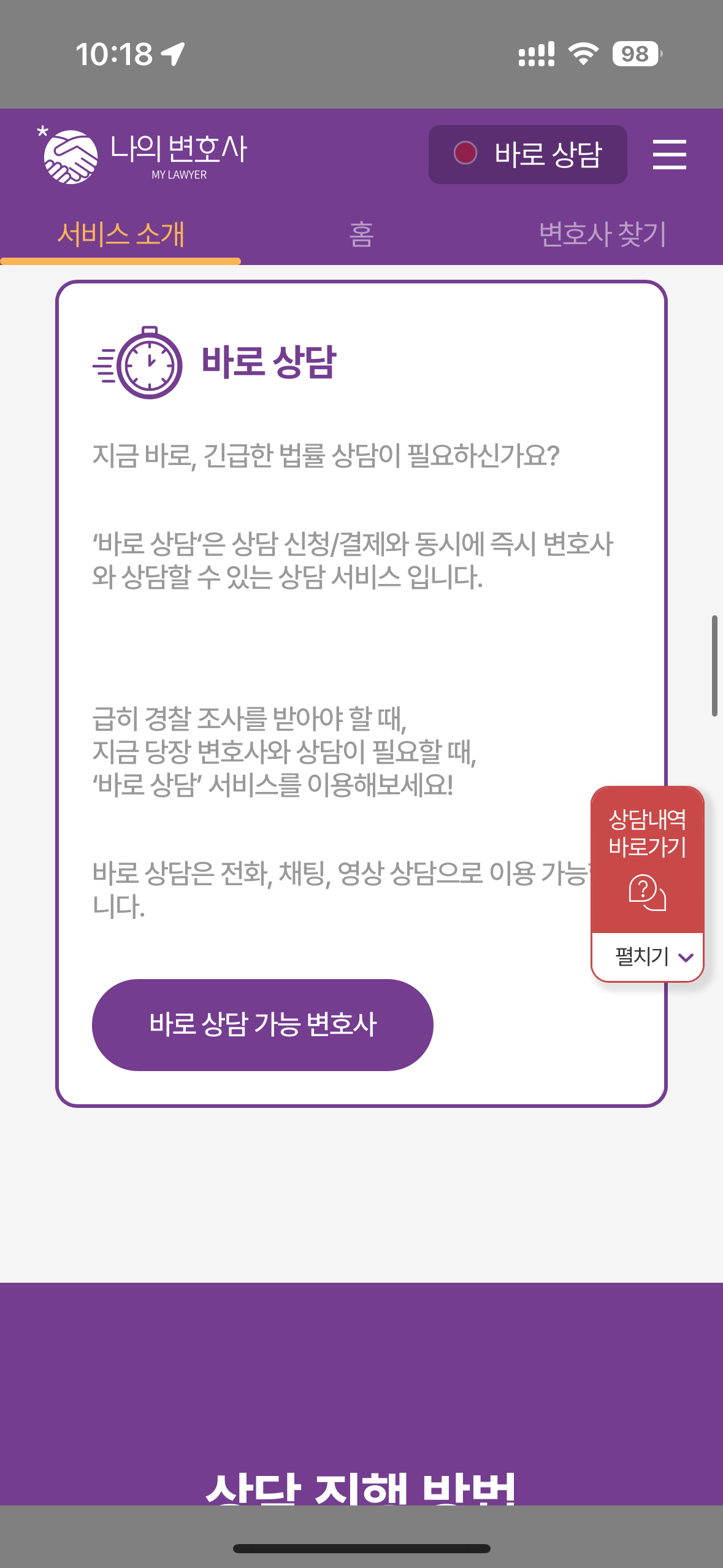 상황에 따른 문제를 해결하기 위한 상담이 필요하거나 급히 경찰조사를 받아야 하는 상황등 여유 있게 알아보고 대처가 불가능한 때 당장 변호사 상담을 할 수 있는 시스템으로 구성되어 있어 나의 변호사를 통해 법률적인 도움을 받을 수 있습니다.