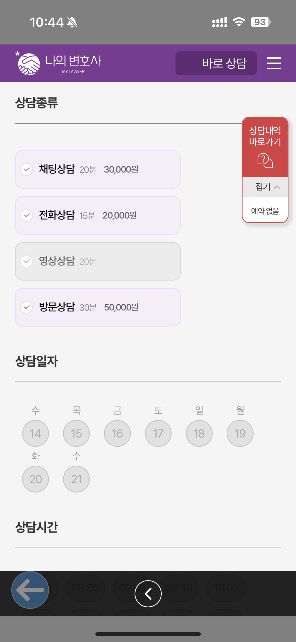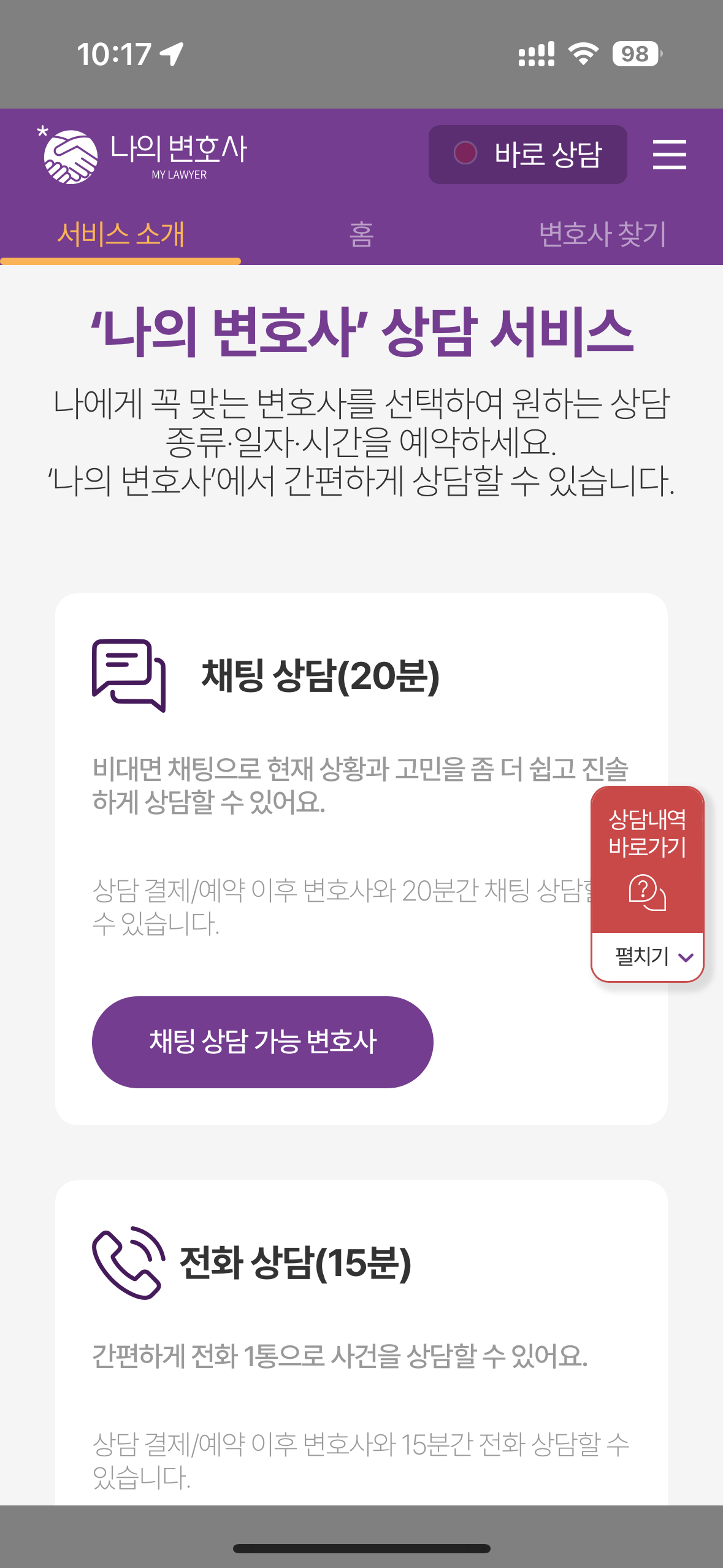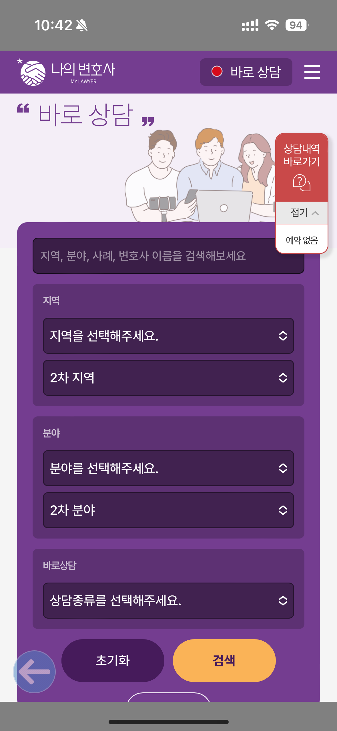 나의 변호사는 예약을 통해 원하는 변호사분과 날짜/시간 약속을 잡아 상담 진행도 가능하지만, 바로 상담을 통해 기다리는 시간 없이 지금 바로 상담을 진행도 가능합니다. 급박한 상황에서 조금이라도 빨리 변호사와 상담이 필요한 경우에 이리저리 헤메이지 않고 이용 가능한 서비스입니다.