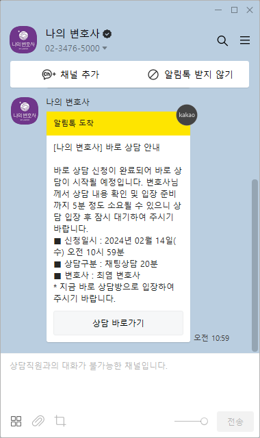 변호사 찾기를 통해 관련해 전문성을 가진 변호사분을 선택한 후 현재 상황에 대한 내용을 간략하게 기재하고 신청했습니다. 바로 상담은 신청 후 결제를 진행하면 알림톡을 통해 예약시간이 아닌 바로 상담을 진행할 수 있는 알림톡이 도착해 바로 상담방으로 입장할 수 있었습니다.