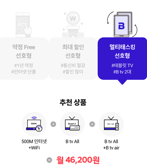 멀티 태스킹을 선호하는 분들이라면 3년 약정으로 500M 인터넷과 WIFI 서비스에 B tv All alc B tv All+ B tv air 서비스가 더해진 상품을 추천드립니다. 월 46,200원의 비용으로 이용 가능하며 모두 안심/ 원격 케어/ 파워 백신 서비스 중 하나를 선택해 제공받을 수 있습니다.