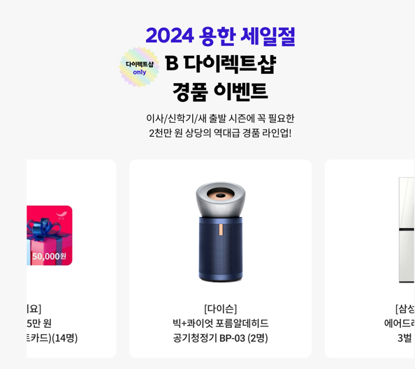 용한 세일절 B다이렉트샵 이사 시즌 필수 경품으로 준비된 라인업을 살펴보면 다이슨 빅+콰이엇 포름알데히드 공기청정기를 비롯해 삼성전자 에어드레서 세트, LG전자 코드제로 오브제 컬렉션 R9 로봇청소기+올인원타워, 비스포크 슈드레서 집들이 5종 대용량 티슈세트등 이사와 함께 꼭 필요한 아이템으로 구성되어 있어 욕심이 날 정도입니다.