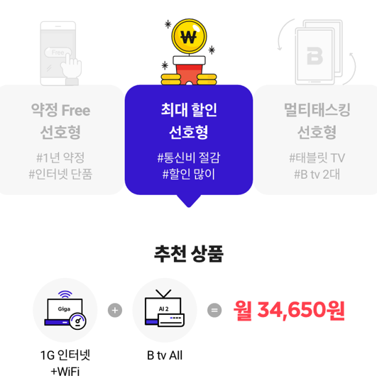 짧은 약정보다 더 많은 할인을 원한다면 최대 할인 선호형 추천상품이 제격입니다. 3년 약정은 그대로 가져가면서 1G 인터넷과 WIFI 그리고 B tv All 서비스까지 더해 월 34,650원이라는 비용으로 이용 가능합니다. B다이렉트 전용 경품 이벤트 참여도 가능하며, 사은품 대신 인터넷 요금할인도 가능합니다.