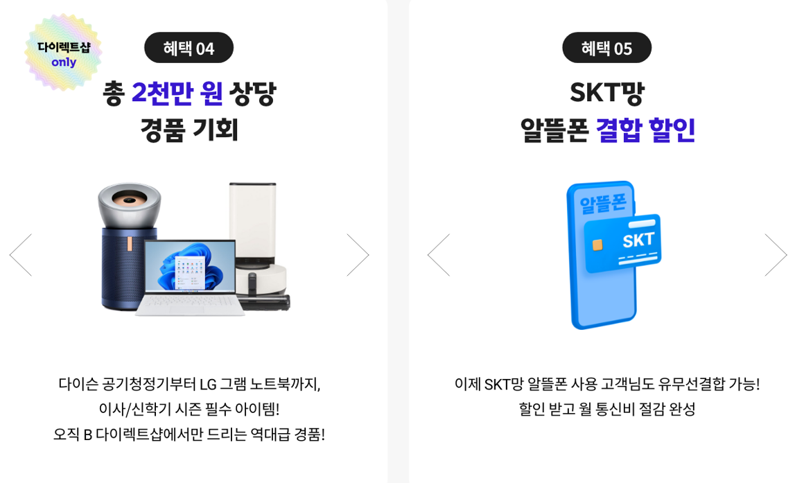용한 세일절이 진행되고 있는 B다이렉트 샵은 국가 만족도 13년 연속 1위에 빛나는 SK브로드밴드 공식 온라인샵입니다. 온라인 가입 고객 한정 월 2,200원의 추가 할인이 제공되고 누구나 쉽게 결합하하고 더 많이 할인받을 수 있는 요즘가족결합이 신규 출시되어 선택 가능합니다. 또한 24시간 가입과 당일설치도 가능하고, 금융사기 피해보상, 전공 서적 할인, TV 수리 보상 B다이렉트샵에서만 가능한 B다팩도 준비되어 있어 믿고 선택할 수 있는 장점을 가지고 있습니다.
