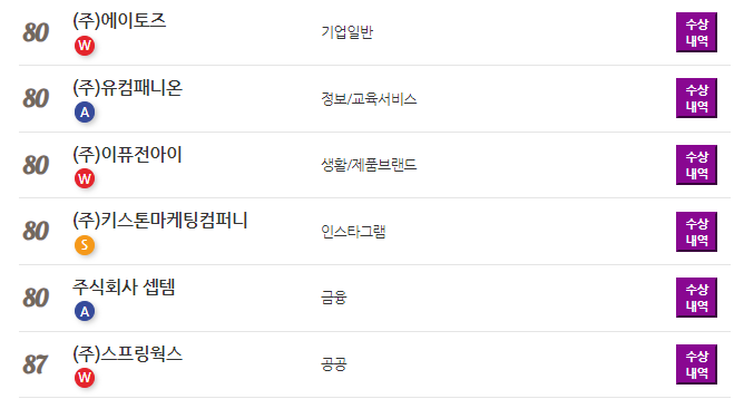 베스트 디지털에이전시 랭킹은 순위와 기업명/ 분야 및 수상 항목이 표기되어 기본 사항에 대한 내용을 빠르게 파악할 수 있고, 수상내역을 클릭하면 해당 기업의 상세한 정보를 확인할 수 있습니다.