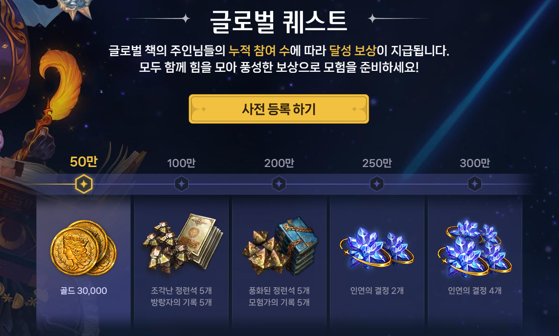 글로벌 퀘스트도 사전등록과 함께 진행되는데요, 사전등록에 참여한 인원수가 50만, 100만, 200만, 250만 그리고 300만에 도달하면 그에 따른 보상이 수령할 수 있습니다. 무엇보다 보상은 누적지급으로 진행되는데요, 사전등록 오픈 하루 만에 50만 인원을 넘어갈 정도로 이목이 집중되어 있어 300만 돌파는 어렵지 않을 것으로 예상됩니다.