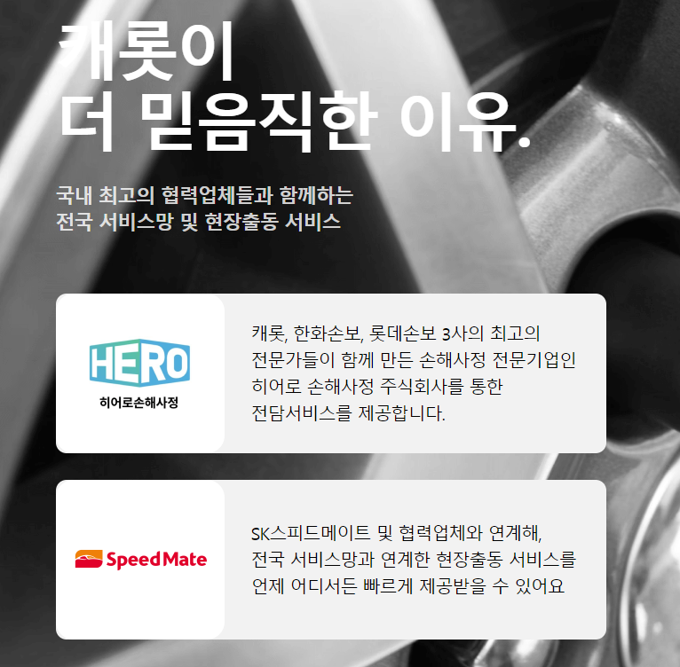 자동차보험 선택시 놓치지 말고 챙겨야 하는 내용 중 하나 바로 현장 출동 서비스입니다. 보험이라는 게 긴급한 상황에 도움을 받기 위함인데, 차량과 연관된 상황은 늘 급박하기 마련이기 때문인데요, 캐롯퍼마일자동차보험은 히어로손해사정을 통한 전담 서비스를 제공하고, SK스피드메이트와 협력업체를 연계해 전국 어디서든 현장출동 서비스를 빠르게 받을 수 있어 든든합니다.