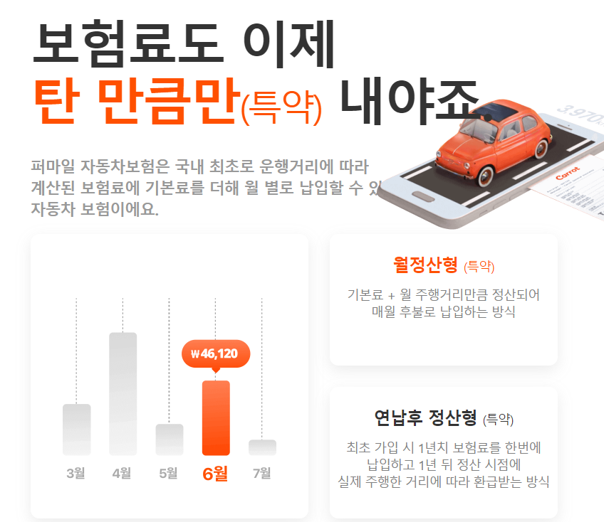 캐롯손해보험에서 선보이는 캐롯퍼마일 자동차보험은 월정산형(특약)과 연납후 정산형(특약)으로 구분되어 있기 때문에 본인의 상황과 운전 패턴에 적합한 방식을 선택할 수 있는 점이 특징인데요, 각 특약이 가진 정산 방식을 확인해 내게 꼭 맞는 특약 선택이 가능합니다.