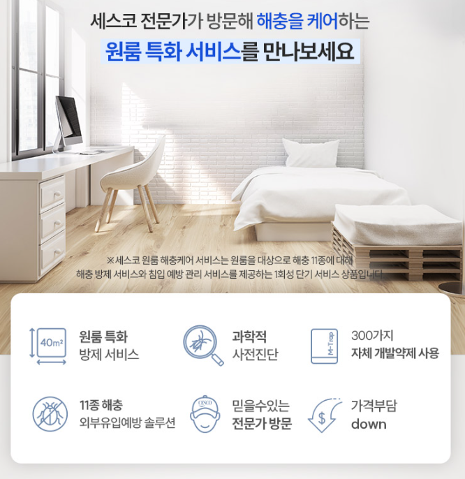세스코 원룸 해충 케어 서비스는 원룸을 대상으로 해충 11종에 대한 해충 방제 서비스와 침입 예방 관리를 제공하는 서비스입니다. 무엇보다 세스코 전문가가 방문해 케어하는 원툼 특화 서비스인 만큼 가격부담도 적고 믿을 수 있는 전문가의 케어를 받을 수 있는 장점을 가지고 있습니다.