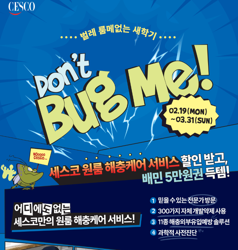 세스코 해충 케어 서비스를 이용하면 참여 가능한 벌레 룸메없는 새 학기 Don't Bug Me 이벤트도 진행 중입니다. 프로모션 기간 중 세스코몰에서 원룸 해충케어 서비스를 구매하면 즉시 사용 가능한 할인 쿠폰을 증정하는데요, 서비스 후 리뷰를 남기면 20명을 선정해 배민 5만 원권도 증정하고 있으니 해충도 잡고 선물도 꼭 챙겨보시기 바랍니다.