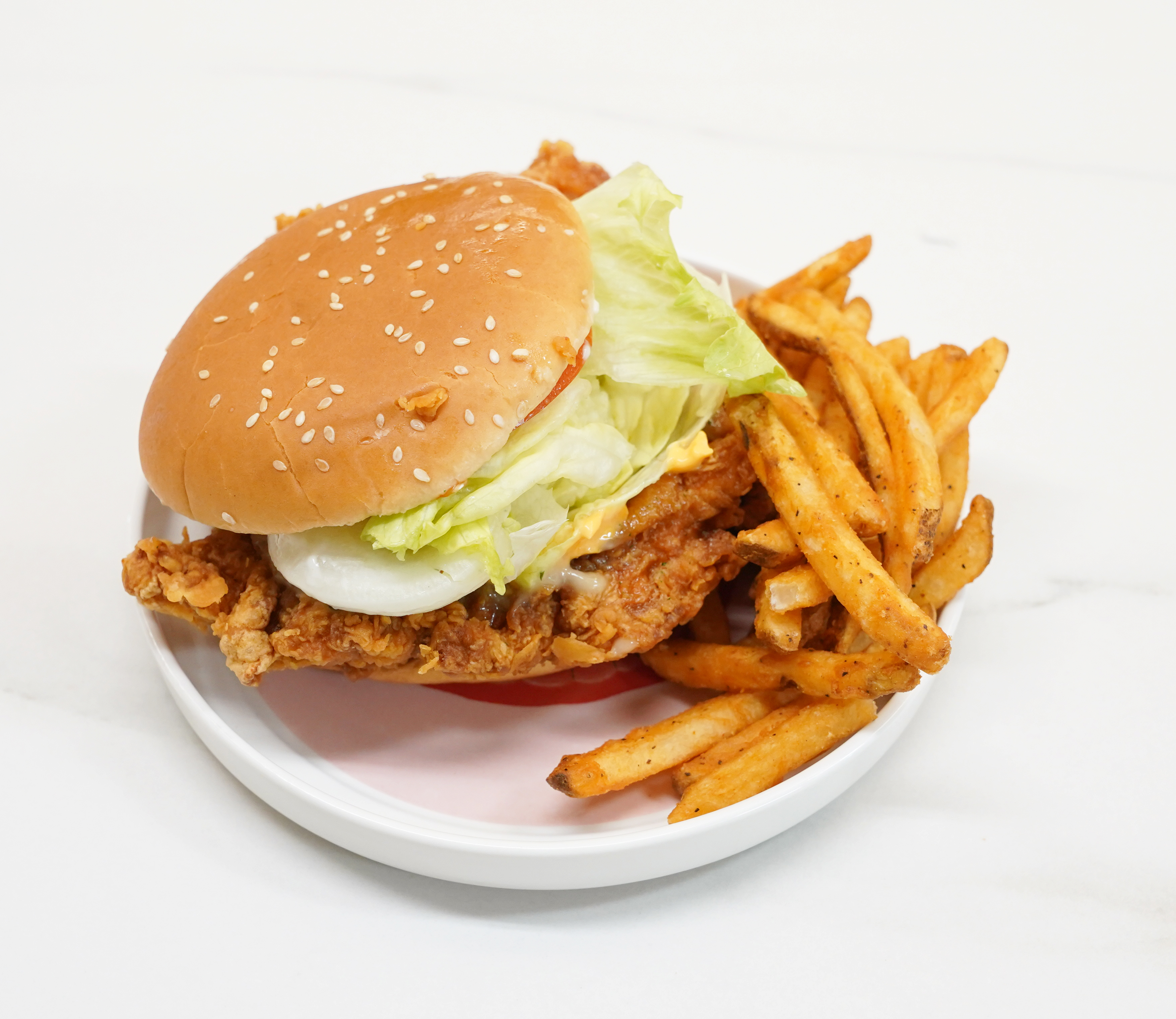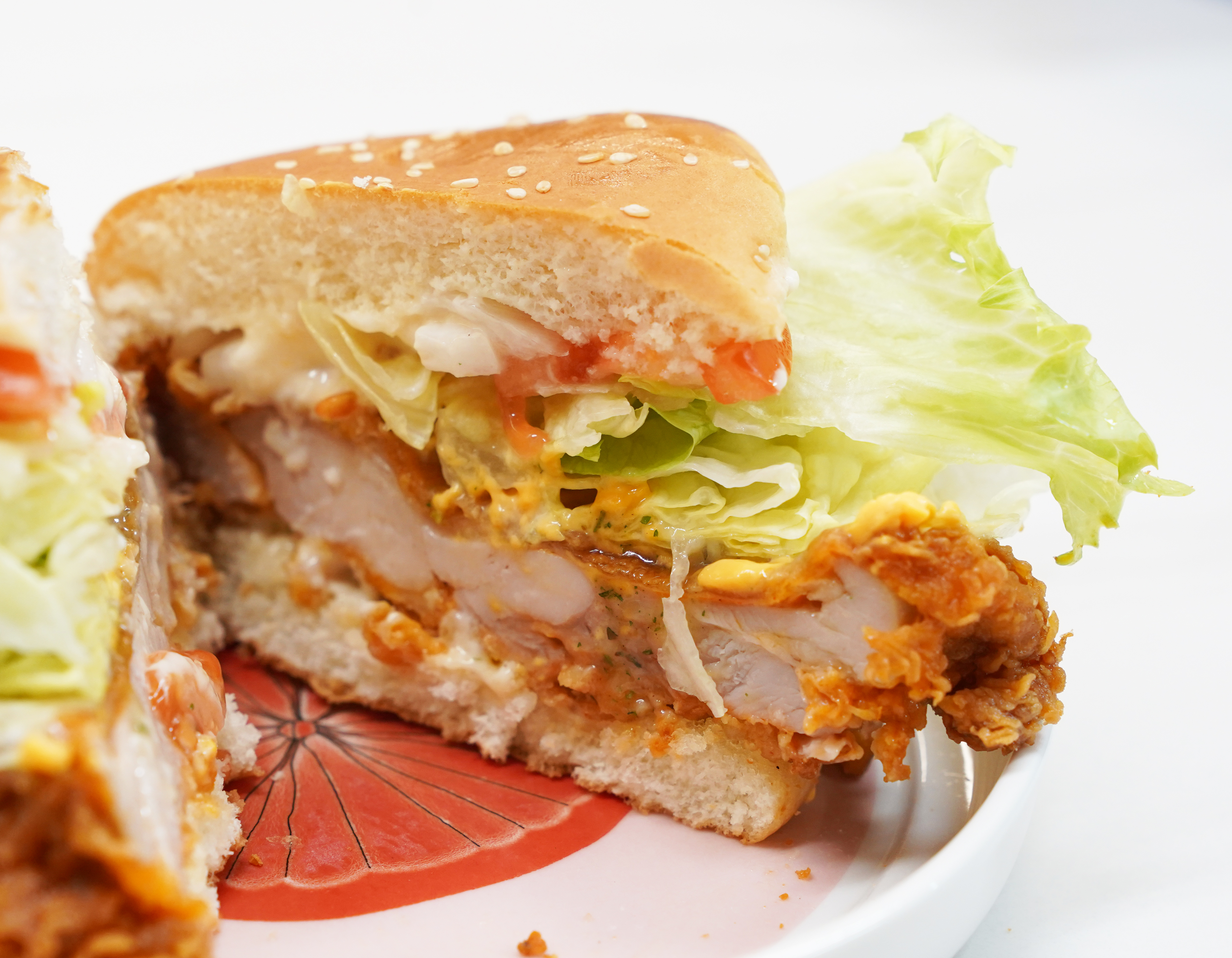슈퍼싸이버거를 이등분한 모습입니다. 가장 먼저 눈에 들어오는건 닭다리살로 만들어진 두툼한 빅싸이버거패티였는데요, 싱싱한 토마토와 양상추 그리고 그 사이이 뿌려진 풍미 가득한 갈릭소스까지 한입에 맛을 볼 수 있을까 싶을 정도로 재료를 아낌없이 넣은 점이 마음에 쏙 들었습니다.