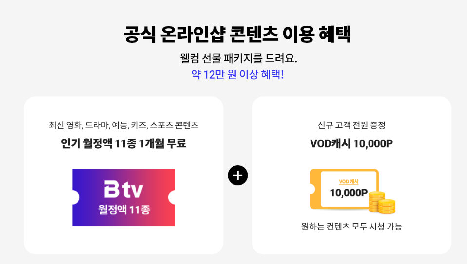 공식 온라인샵 콘텐츠를 이용할 경우 약 12만원 상당의 웰컴 선물 패키지도 받을 수 있습니다. 해당 선물 패키지는 최신 영화, 드라마, 예능, 키즈, 스포츠 콘텐츠 등 인기 월정액 11종을 1개월 무료로 이용할 수 있는 콘텐츠 사용권과 원하는 콘텐츠를 선택 시청할 수 있는 VDO 캐시 10,000P로 구성되어 있어 유용합니다.
