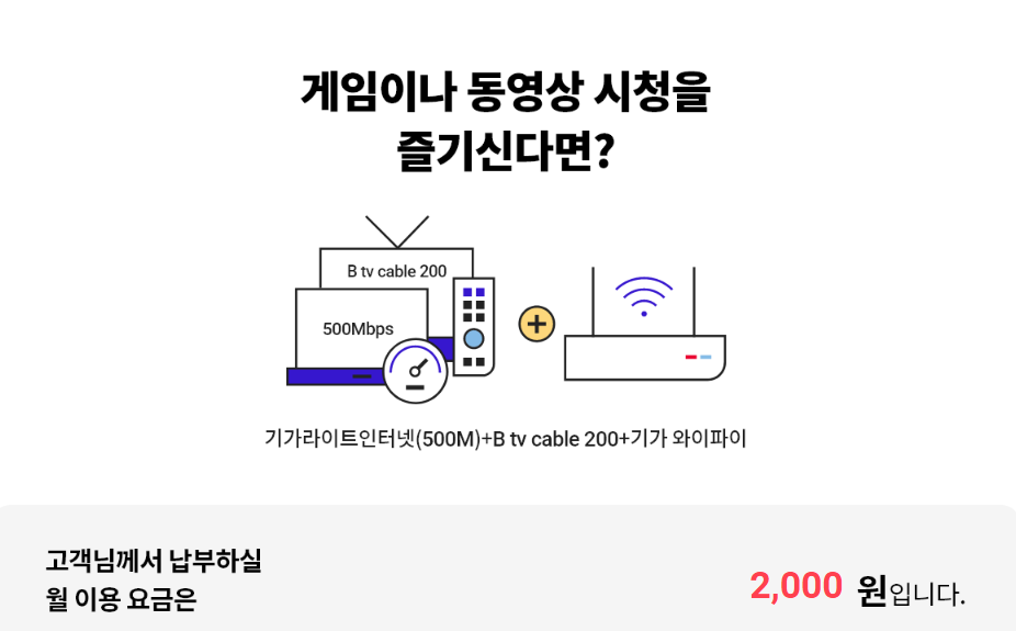 SK브로드밴드에서 선보이는 기가인터넷 + B tv cable 200 + WiFi 상품의 경우 SKT를 이용 중인 분들이라면 월 2천 원으로 인터넷과 TV를 마음껏 즐길 수 있는 상품입니다.