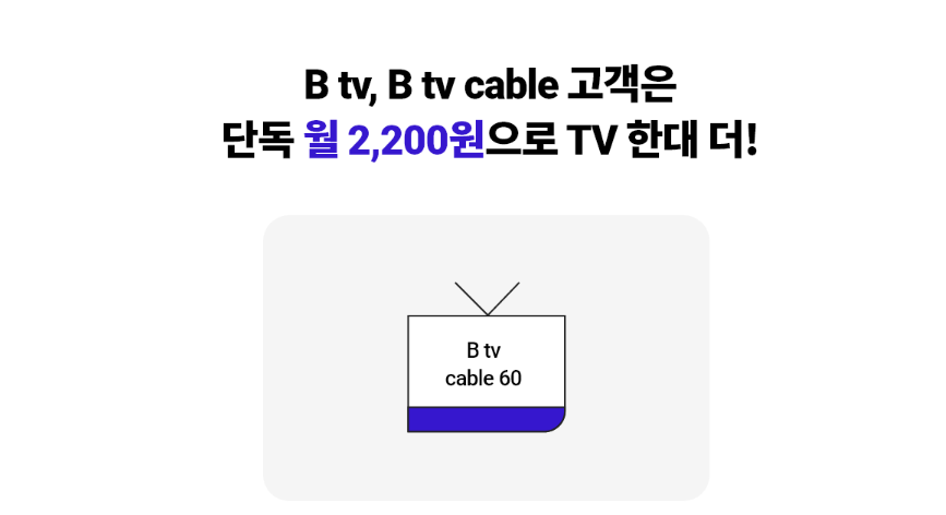 Btv, Btv cable 고객의 경우 단독 월 2,200원으로 TV를 한대더 이용할 수 있는 서비스를 제공하고 있는데요, 두대 이상 TV를 사용하고 있는 가정이라면 이보다 더 좋은 조건으로 기가인터넷과 케이블 TV를 사용할 수 있는 상품은 없을 거라 생각됩니다.