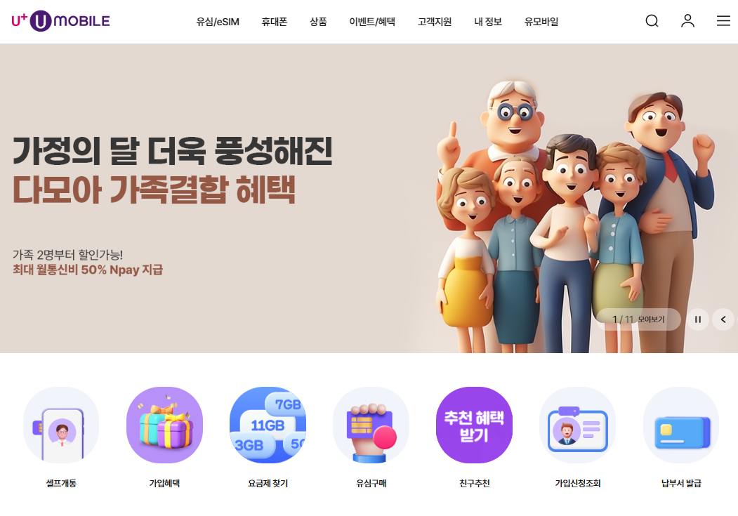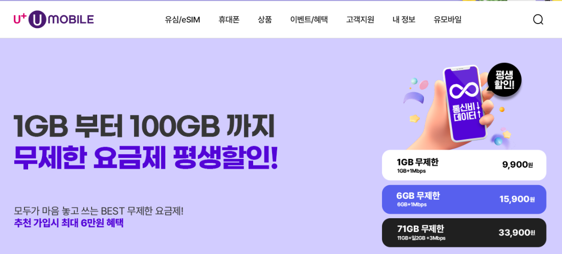 알뜰폰요금제부터 토탈서비스 케어, 휴대폰보험서비스까지 다양한 서비스가 준비되어 있는 유모바일은 LG U+자회사로 받을 수 있는 통신사로, 합리적인 요금제와 다양한 서비스를 제공하고 있습니다. 무엇보다 알뜰폰업체는 CS응대가 어렵다고 하지만 유모바일의 경우 전담 고객센터를 운영하고 있고, APP을 통해서도 얼마든지 원하는 서비스를 이용할 수 있어 편리합니다.