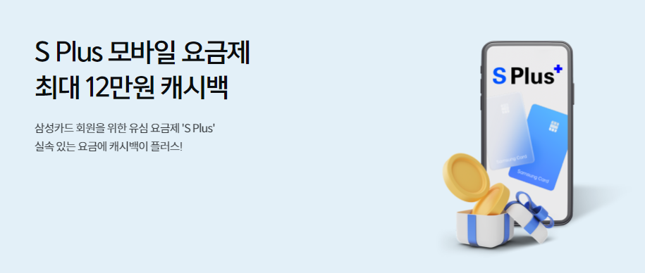 또한 S Plus 요금제는 이통사 LTE 요금제와 비교했을 때 데이터는 더 받고 매월 최대 4만 원까지 절약 가능한 장점을 가지고 있어, 삼성카드를 보유하고 있는 분들이 라면 12개월 동안 캐시백도 받고, 저렴한 비용으로 알뜰폰 요금제를 사용해 보시길 추천드립니다.