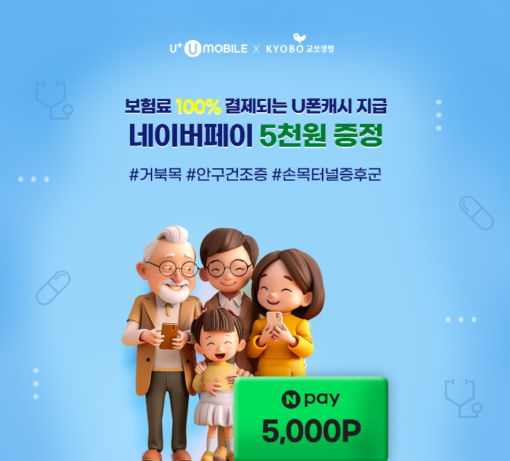 U폰캐시는 마케팅 수신 동의를 하면 수령 가능하며, 별도의 보험료 납부 없이 원하는 보험을 가입할 수 있는 장점을 가지고 있습니다. 무엇보다 휴대폰질병보험 상품은 8천 원 미만으로 지급되는 U폰 캐시로 100% 결제 가능한데요, 해당 보험 가입 시 네이버 페이 5천 원 쿠폰도 지급되어 유용합니다.