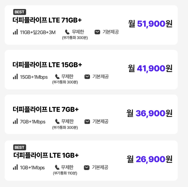 더피플라이프 요금제는 데이터를 포함한 통화 및 문자 기본 제공이라는 조건을 바탕으로 데이터 사용량에 따라 월 2만원대부터 5만 원대까지 선택가능한 4종의 요금제가 준비되어 있는데요, 저렴한 비용으로 데이터를 이용할 수 있고, 무제한 통화가 가능한 장점을 가지고 있습니다.