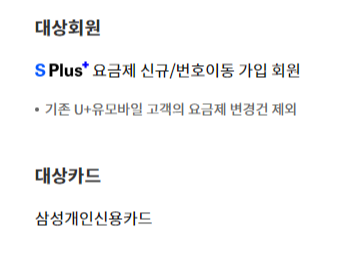 S Plus 요금제 신규 또는 번호이동 가입회원이면 누구나 가입 가능하며, 삼성카드를 소지하고 있다면 전월실적 상관없이 가입할 수 있는 장점을 가지고 있다. 무업소다 캐시백을 받으면 0원으로 이용 가능한 요금제도 있어 본인이 아닌 자녀 요금제로 손색이 없을 정도이다.