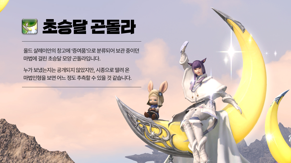 새로운 아이템 신규 탈것 초승달 곤돌라와 가격과 성능 실속까지 모두 챙긴 맞춤형 이용권 패키지도 출시되었습니다. 초승달 곤돌라는 마법에 걸린 초승달 모양 곤돌라인데요 다른 유저들의 시선을 한 몸에 받을 수 있는 특별한 아이템으로 손색없을 정도입니다. 기간 한정으로 구입 가능한 전투 또는 생활  맞춤형 이용권 패키지도 놓치지 마세요.