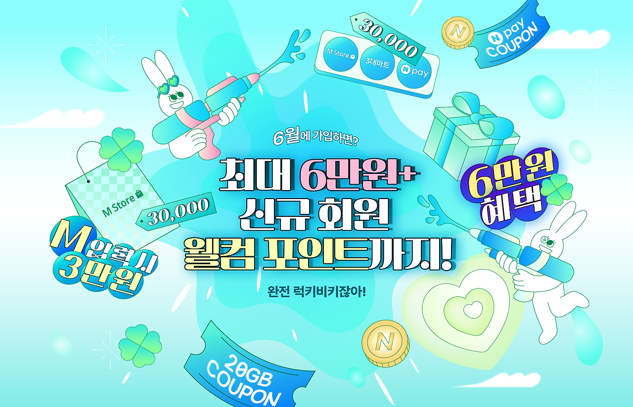 kt M모바일 알뜰폰 요금제를 선택하면 통신비도 절약되지만 신규회원 가입 이벤트를 통해 보다 많은 혜택도 챙길 수 있습니다. 6월에 가입하는 신규 회원의 경우 5천 원 이상 요금제 가입 시 100% 3만 원을 지급하고, 친구 초대 및 추천인 입력으로 최대 6만 원 혜택과 웰컴포인트 수령이 가능합니다. 여기에 추첨을 통해 최대 10만 원 경품이 지급된다고 하니 통신비도 절약하고 선물도 챙기는 일석이조의 즐거움을 누릴 수 있습니다.