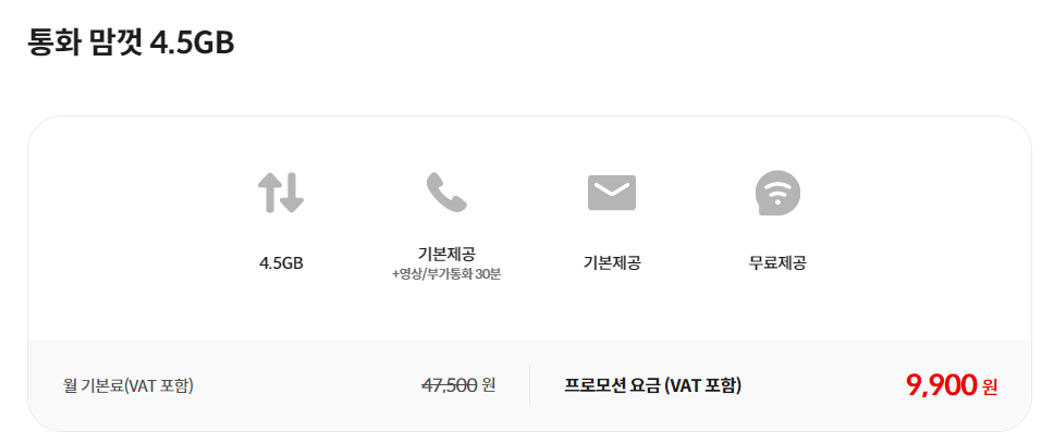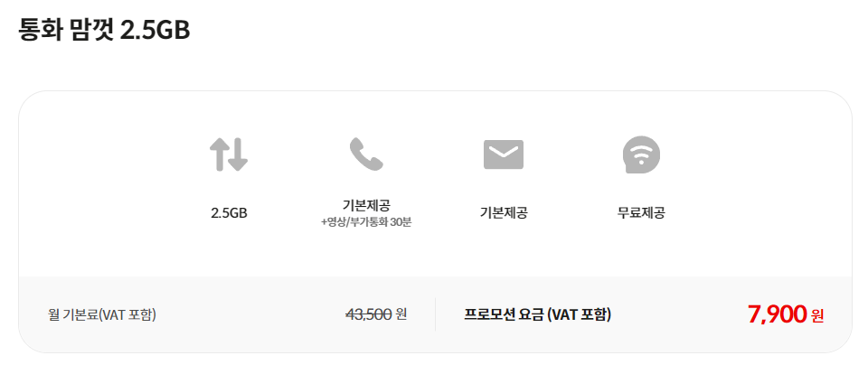 통화 맘껏 2.5GB 요금제는 7,900원 비용으로 통화/문자 무제한 이용이 가능하며 2.5GB 데이터를 이용할 수 있는 요금제입니다. 가격대비 데이터 이용량이 많아 1.5GB 데이터가 조금 부족하다고 생각되는 분들에게 1만원 이하 비용으로 가입할 수 있는 요금제로 안성맞춤입니다.