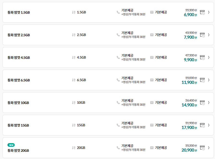 일반적인 요금제를 이용하는 분들들이라면 2만원대 비용으로 이용 가능한 통화 맘껏 20GB 요금제가 가장 활용하기 좋은 요금제입니다. 통화 맘껏 요금제 중 가장 많은 데이터를 제공하는 요금제이기도 한데요, 기존에 이용하던 습관 그대로 이용하면서 통신비는 줄이고 싶은 분들에게 딱 맞는 요금제입니다.