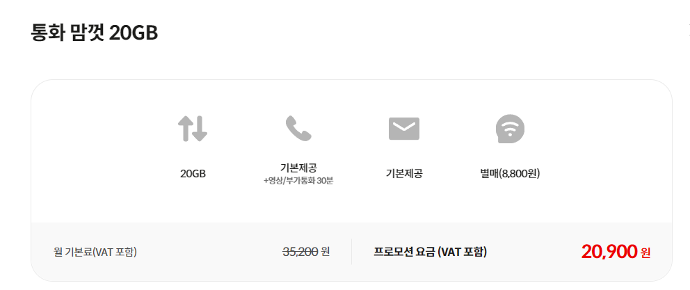 일반적인 요금제를 이용하는 분들들이라면 2만원대 비용으로 이용 가능한 통화 맘껏 20GB 요금제가 가장 활용하기 좋은 요금제입니다. 통화 맘껏 요금제 중 가장 많은 데이터를 제공하는 요금제이기도 한데요, 기존에 이용하던 습관 그대로 이용하면서 통신비는 줄이고 싶은 분들에게 딱 맞는 요금제입니다.