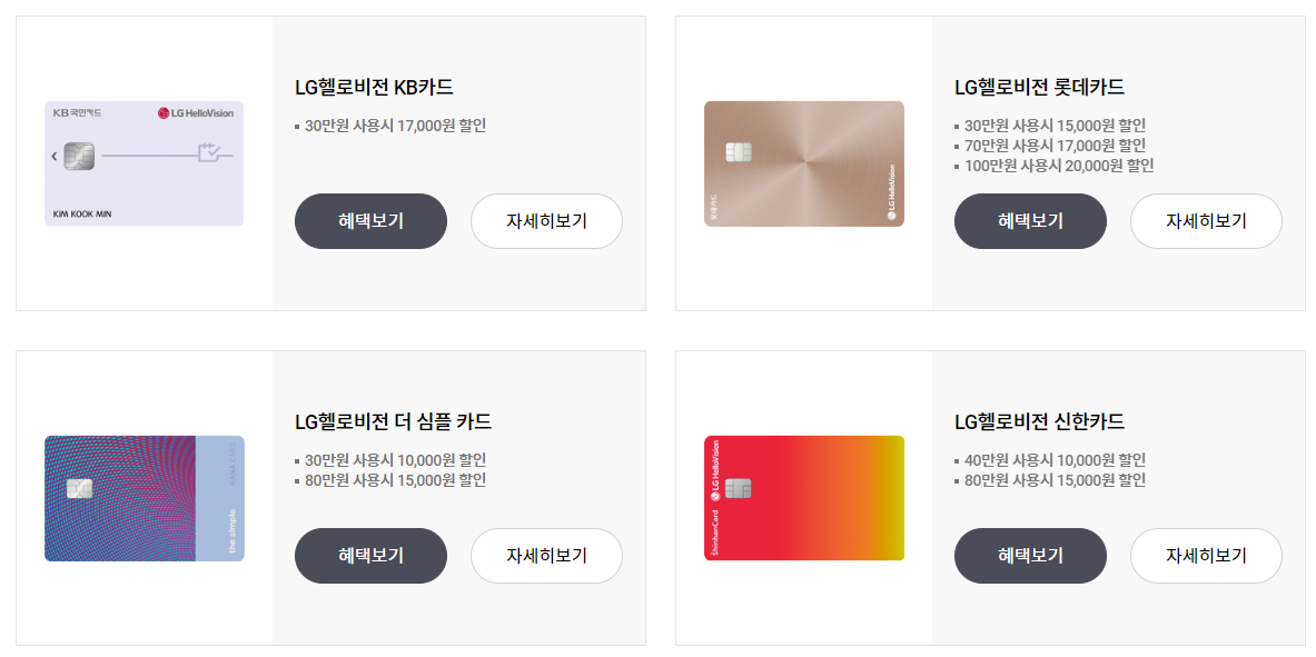 LG헬로비전의 경우 제휴 할인카드 폭이 넓고, 카드마다 매월 사용하는 금액에 따른 할인폭도 달라 소비를 고려한 선택을 할 수 있습니다. 또한 최소 사용 비용에 따른 할인 금액도 다르기 때문에 이를 고려하는 것이 좋은데요, 주로 이용하는 카드사라 아니더라도 선택 가능한 만큼 꼼꼼히 비교하고 선택하는 걸 추천드립니다.