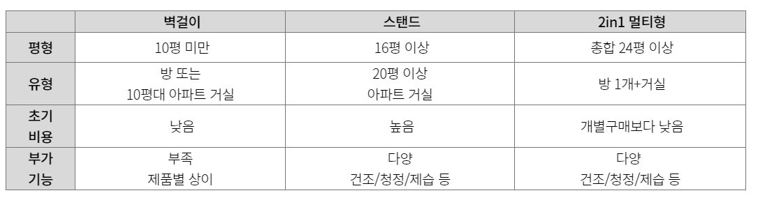 우리집에 꼭 맞는 에어컨을 선택하고 싶은 분들이라면 거주하는 집 유형을 고려한 평형대를 확인하고 그에 맞는 제품을 선택하는 걸 추천드립니다. 에어컨은 같은 평형이라면 벽걸이와 스탠드 어떤 제품을 선택하더라도 시원함은 동일한데요,  벽걸이 제품을 선택했는데 시원하지 않는다면 평수에 비해 작은 제품을 사용하기 때문입니다. 실제 벽걸이는 작은 평수에 맞춘 제품이 대다수이고, 스탠드는 보다 넓은 평수에서 사용할 수 있는 제품들이 주를 이루고 있습니다.