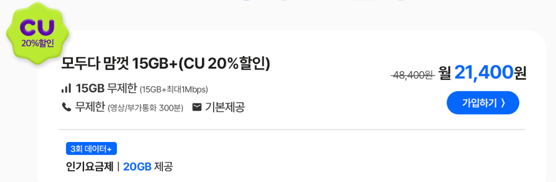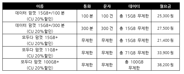 모두다 맘껏 15GB+(CU 20%할인)요금제의 경우 21,400원 비용으로 데이터 15GB+최대 1Mbps / 통화 무제한 / 문자 무제한으로 사용가능해 통화/문자 이용이 많은 분들에게 추천드리는 요금제입니다. 여기에 CU20%혜택으로 월 5천원 할인까지 받을 수 있으니 생활비와 통신비를 모두 줄일 수 있는 가성비 높은 요금제입니다.