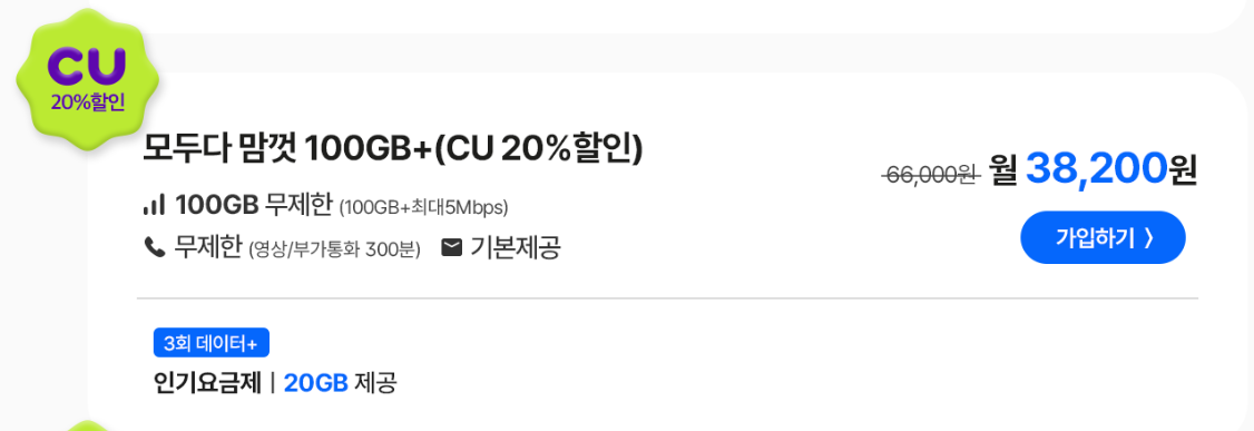 모두다 맘껏 100GB+(CU 20%할인)요금제는 월 38,200원 비용으로 데이터 100GB+ 최대 5Mbps / 통화 무제한 / 문자 무제한 이용이 가능합니다. OTT시청이나 유튜브, 모바일게임 등 데이터 사용량이 많은 분들을 위한 요금제인데요, 100GB를 모두 소진해도 최대 5Mbps 속도로 이용 가능하기 때문에 3만원대 비용으로 많은 데이터를 사용하고 싶은 분들에게 추천드립니다.