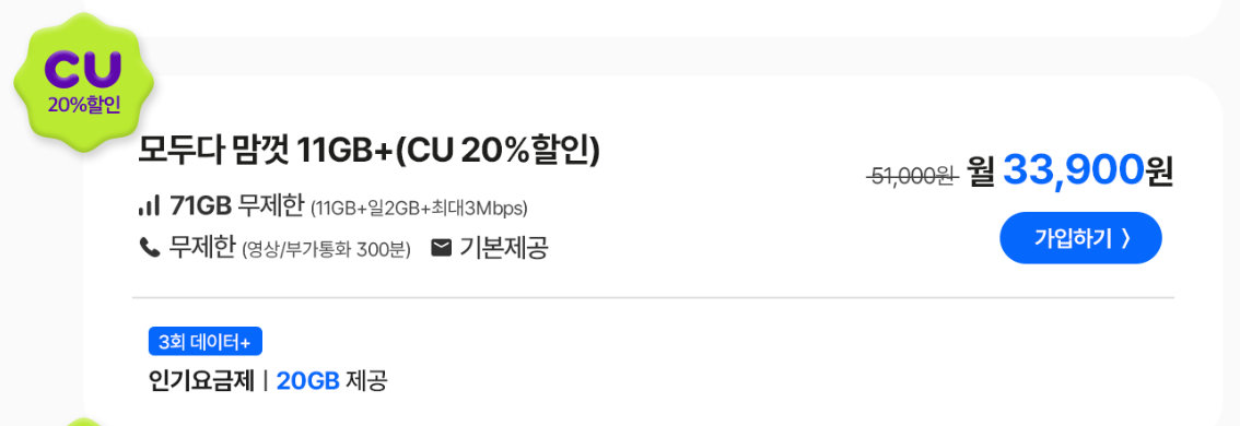 모두다 맘껏 11GB+(CU 20%할인)요금제는 33,900원 비용으로 데이터 11GB+일2GB+최대 3Mbps / 통화 무제한 / 문자 무제한이용이 가능합니다. 월 최대 71GB까지 데이터가 제공되어 이용 가능한데요, 해당 데이터를 모두 소진해도 최대 3Mbps로 무제한 이용 할 수 있어 데이터 사용량이 일정하지 않지만 여유롭게 이용하고 싶은 분들에게 맞는 요금제입니다.