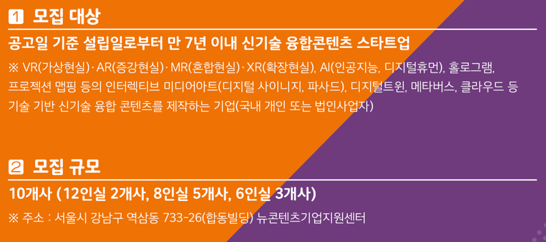 * 신기술 융합콘텐츠 스타트업 기준 : VR(가상현실)·AR(증강현실)·MR(혼합현실)·XR(확장현실), AI(인공지능, 디지털휴먼), 홀로그램, 프로젝션 맵핑 등의 인터렉티브 미디어아트(디지털 사이니지, 파사드), 디지털트윈, 메타버스, 클라우드 등 기술 기반 신기술 융합 콘텐츠를 제작하는 기업(국내 개인 또는 법인사업자)