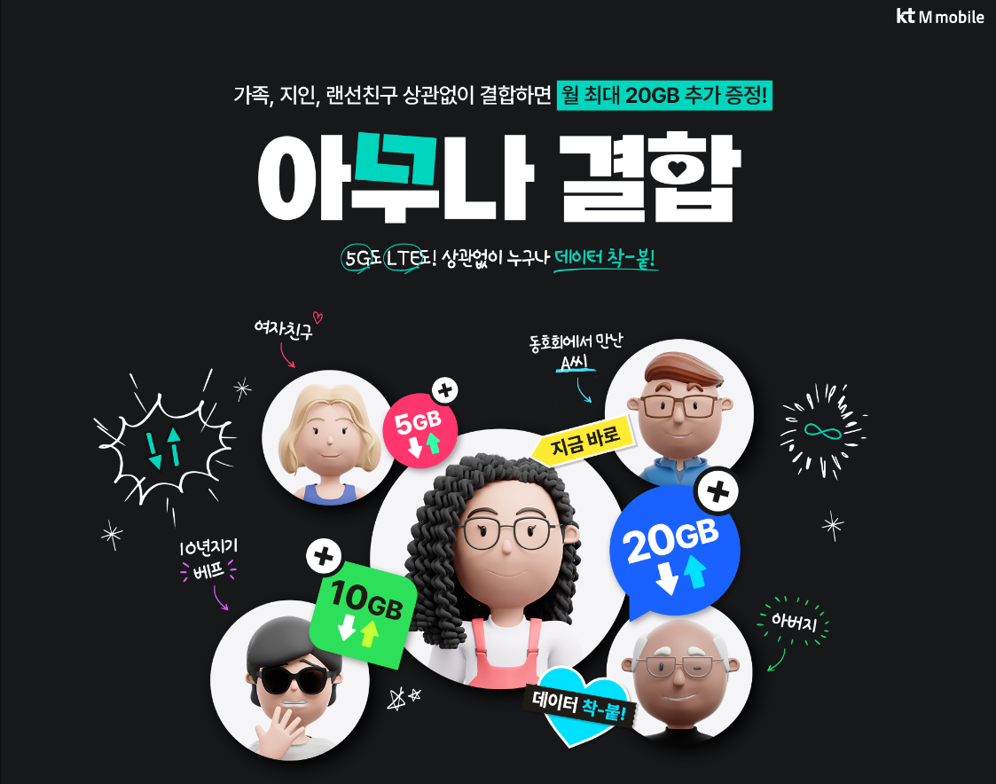 kt M모바일에서 제공되는 서비스도 놓칠 수 없는 부분입니다. 아무나 결합의 경우 kt M모바일 고객이라면 가족이 아니더라도 누구나 결합이 가능한데요, 아무나 결합 시 요금제별 5GB부터 최대 20GB 데이터를 추가로 제공받을 수 있어 유용합니다.