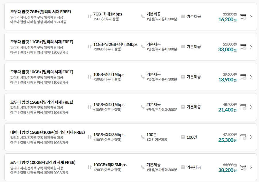 평소 와이파이 사용 횟수가 높고 데이터 사용이 많지 않다면 1만원대 요금제로 사용 가능한 모두 다 맘껏 7GB+ 요금제를 추천드립니다. 7GB 데이터에 최대 1Mbps 무제한 이용 가능하고 밀리의 서재까지 무료로 이용할 수 있는 가성비 갑 요금제라고 할 수 있는데요, 아무나 결합까지 더해지면 월 5GB 데이터를 추가로 제공받아 총 12GB 데이터 사용이 가능해 이보다 더 저렴하면서 가성비 좋은 요금제는 찾기 힘들 정도입니다.