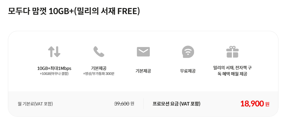 10GB 데이터에 최대 1 Mbps로 무제한 이용 가능한 모두다 맘껏 10GB+ 요금제도 1만원대로 이용 가능합니다. 데이터 10GB+ 아무나결합 시 추가 10GB +최대 1Mbps / 통화 무제한 / 문자 무제한을 모두 선택한 비용이 월 18,900원인데요, 밀리의 서재 월 구독료가 월 9,900원인걸 감안하면 1만 원도 안 되는 비용으로 데이터를 비롯해 통화, 문자를 무제한으로 이용가능합니다. 무엇보다 정해진 기간 없이 평생 이용 할 수 있어 만족도가 높은 요금제입니다.