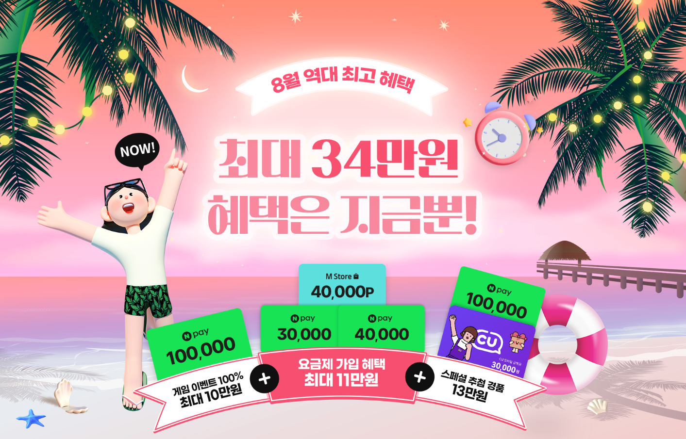 8월 한정 진행되는 이벤트도 다양합니다. 100% 당첨 스크래치 이벤트에 참여하면 네이버페이 포인트 3만 원을 시작으로 최대 10만 원 당첨의 혜택을 노려볼 수 있고, 추첨을 통해 갤럭시 Z6 모바일을 받을 수 있는 kt M모바일 신규 가입 이벤트가 진행되고 있습니다.