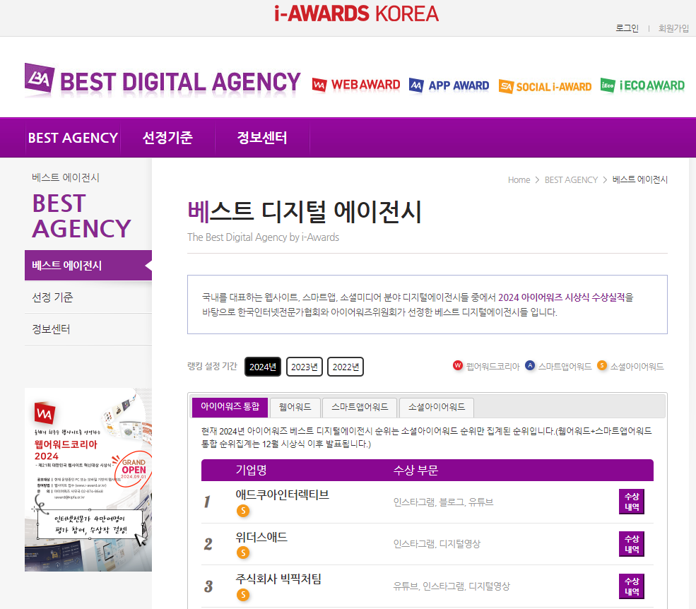 베스트 디지털에이전시 랭킹 확인하기 : http://www.i-award.or.kr/Ba/