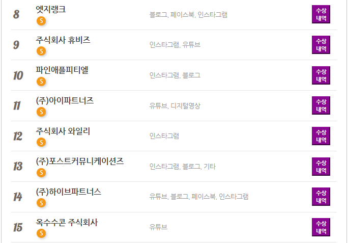 이외에도 차이커뮤니케이션, 콘센트릭스서비스코리아, 센터플러스, 대학내일, 엣지랭크, 휴비즈, 파인애플피티엘 등의 디지털에이전시가 소셜아이어워드 2024에서 최고대상 및 혁신대상, 분야별 대상 등을 수상하면서 소셜 마케팅을 대행하는 전문 기업으로 역량을 갖춘 아이어워즈 선정 베스트 디지털에이전시 TOP 10에 등극했습니다.